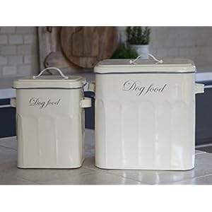 Chic Antique Set of 2Â Metal and Enamel Dog Food Storage Canisters Boxes Cream