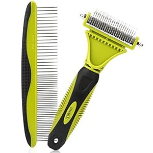 Pecute Grooming Dematting Comb Tool Kit – Double Sided Blade Rake Comb + Grooming Comb – Removes Loose Undercoat, Knots, Mats and Tangled Hair