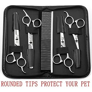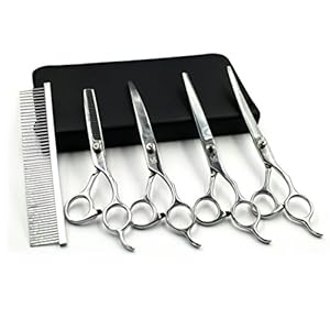 Pet Grooming Scissors Set, Welltop Professional 4 Pieces Stainless Steel Pet Trimmer Kit, Used for Dog or Cat – With 7.5-inch Cutting Scissors, Thinning Shear, Curved Scissors, Grooming Comb