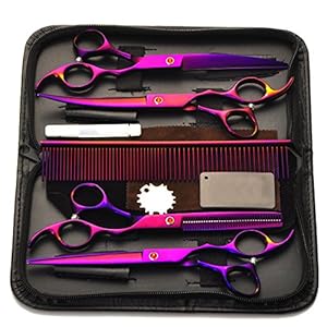 Dog Grooming Scissors, Fancyli Rainbow 7 inches Pet Stainless Steel Curved Scissor Suit Provided With Curved Thinning Shear and Steel Grooming Comb Set