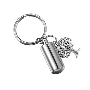 HOUSWEETY Silver Tone Tree of Life Cylinder Pet Cremation Urn Keychain Memorial Keepsakes Key Chains