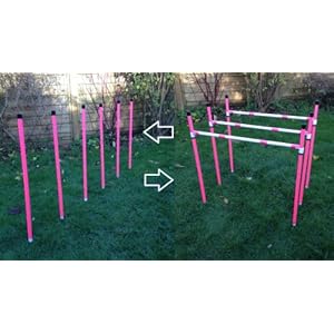 pink dog agility weave poles which convert to 3 dog agility training jumps. (due to amazons new postage policy we can only post this item to mainland uk (England, Wales, and Scotland only))
