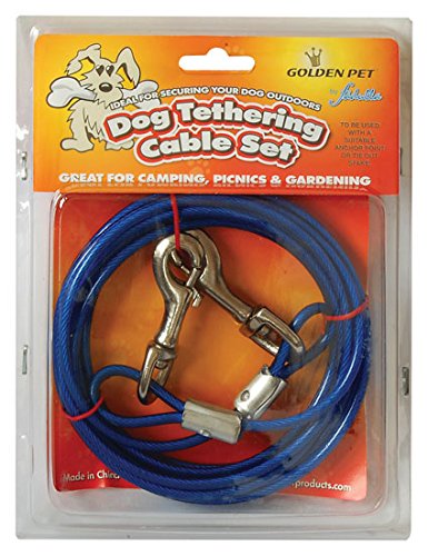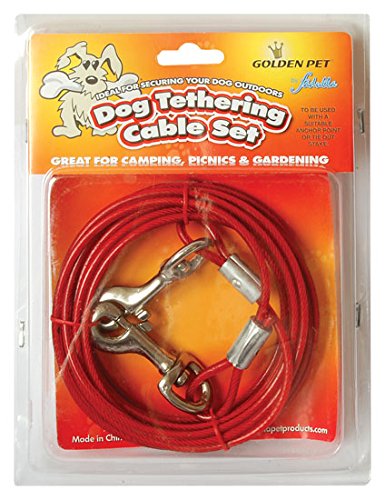 Product description. Ideal for securing your pet outside, these double end connector cables can be used with any suitable anchor point or tie out stake. Supplied in pairs, each cable measures 15ft / 4.5mtrs and has a thickness of 5mm. Can be joined together to make a longer cable or for use with 2 dogs. Great for camping, picnics, gardening etc.Never leave your pet unattended and ensure that they are protected from the weather and have a fresh water supply available. Not recommended for large breed dogs over 25Kgs. Colours supplied at random.