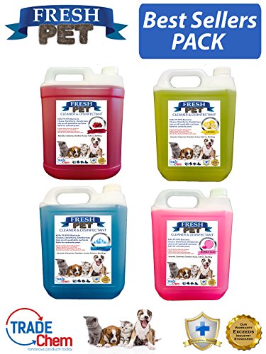 FRESH PET Best Sellers Pack Includes Cherry / Alpine / Lemon & Bubblegum. Kennel / Cattery Cleaner, Disinfectant & Deodoriser A powerful cleaner, disinfectant and deodoriser, effectively destroying a wide spectrum of bacteria, fungi and viruses at the source. It eliminates odours and leaves a fresh fragrance. Safe to use on all water washable surfaces, floors, walls, cages, feeding bowls, bedding, toys, runs, yards, carpets, toilets and drains. Ideal for usage in Kennels and catteries to control: Canine Parvo-virus (type 2), Feline Calici virus and kennel cough etc. Also effective against H1N1 Swine-flu, Newcastle disease, TB, Avian Inflenza Virus and foot & mouth etc.. Unlike conventional disinfectants it will not cause detrimental effect to animals and is safe to use around them. This means there is no need to re rinse the treated area Effective disinfectant to standards: EN1040, EN 1276, EN13697, EN1650, EN1275 EN 14476:2005. Broad spectrum disinfectant to EN1656, EN1657 for use in veterinary environments Economical to use – Dilutes up to 100:1 with water. Destroys bacteria and odours instantly at source Safe to animals paws – does NOT contain phenols, bleaches or pine oils. Can be used on to clean your pets personal hygiene equipment, including feeding bowls etc. Ideal for foot baths, and disinfectant mats. For general use as an effective cleaner, deodoriser and disinfectant dilute at rate of 1: 30 to 100 with water. Apply by spraying, mopping or wiping. For severe odour problems you can use product neat. For disinfection of feeding bowls etc use dilution of 1:100 and rinse thoroughly with clean water. For foot baths and disinfection mats make up fresh solutions regularly with a dilution of 1:50. This product will not harm septic tanks