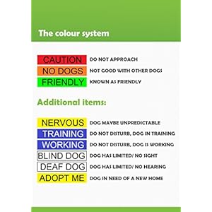 The system: Red ‘CAUTION’ (Do Not Approach) Orange ‘NO DOGS’ (Not good with other dogs), Green ‘FRIENDLY’: (Known as friendly to all), Yellow ‘NERVOUS’, Blue ‘TRAINING’, Blue ‘SERVICE DOG’, White ‘BLIND DOG’, White ‘DEAF DOG’, Purple ‘DO NOT FEED’, Yellow ‘ADOPT ME’