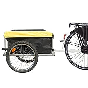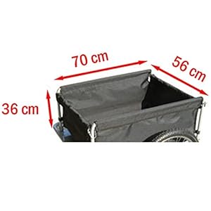 Handy bike trailer with a large cover for transporting luggage and other items. The trailer measures 70 x 56 x 36 cm and contains 140 litres of space.