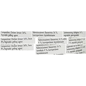 | Style | Chicken with Tuna, Chicken, Beef Liver and Vegetables, Chicken, Ham and Vegetables, Chicken, Vegetables and Rice, Jelly Selection |