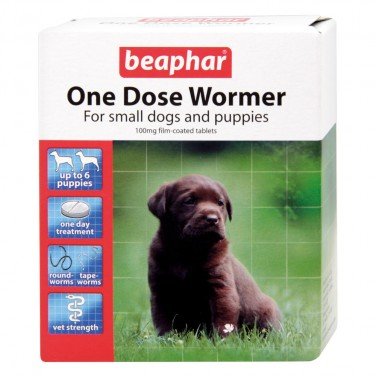 Beaphar One Dose Wormer Small Dog & Puppy treatment for all common roundworms and tapeworms. Contains 6 tablets, and treats a dog weighing up to 6kg on 2 or more occasions. Highly effective against all species of common roundworms and tapeworms found in pet dogs in the UK. Pack size is suitable for first treatment of a whole litter.