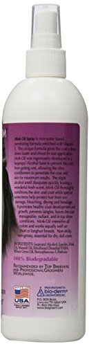 Enriched with Vitamin E, Mink Oil Spray gives the hair a beautiful deep down luster and sheen with one application. It thoroughly conditions coat and skin, while special sunscreens help protect hair from sun damage, bleaching, drying, and breakage. It promotes healthy coat development and growth, leaving the coat manageable and show ring ready. Non-sticky, non-greasy, non-aerosol.Bio-Groom Mink Oil Spray Conditioner for Cats and Dogs Features and Benefits: Non-sticky Non-greasy Non-aerosol Promotes coat growth and development Helps protect from sun damage.