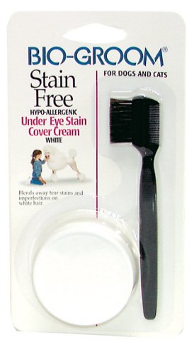 BIO-GROOM Stain Free Hypo-Allergenic Under Eye Stain Cover Dog Cream This incredible product instantly blends away tear stains and imperfections on white hair. This specially developed formula will actually hide flaws and still keep that natural look. Repeated use will gradually lighten stained areas. The cream coating provides protection from discoloring effects of tears. Fragrance free with all natural ingredients. Comes with a cosmetic jar with attached comb/brush.