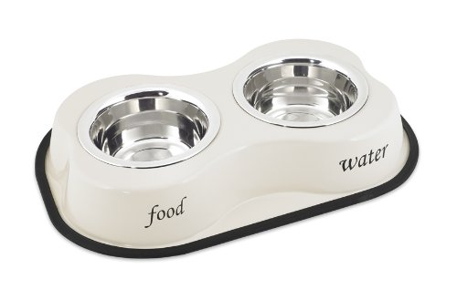 Buddy’s Line Bone Shaped Stainless Steel Double Diners Pet Bowl, Food and Water Print, Ivory
