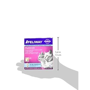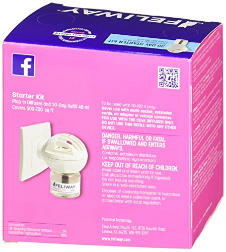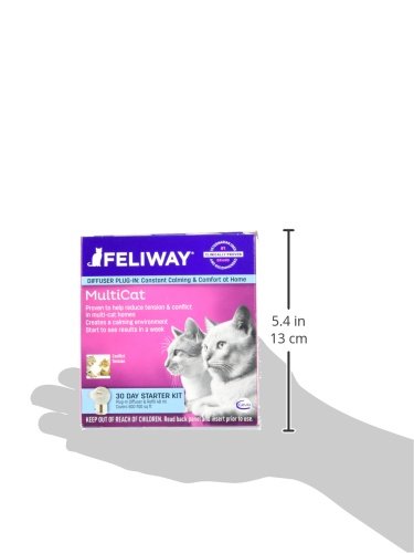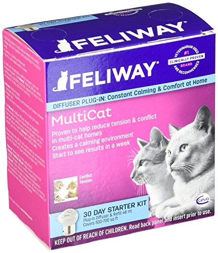 Just plug it in & it works continually for 30 days Each diffuser covers up to 700 square ft Starter Kit includes a 30 day vial for diffuser Contains a clinically tested & appproved synthetic pheromone Recent studies have indicated that Feliway is 90% effective in assisting your cat by reducing and/or eliminating their tendency to scratch and spray urine. Homes with multiple cats can be characterized by tension & conflict, but not any more. Reductions in these types of behaviors is commonly seen within the first 7 days! Feliway MultiCat Plug-In Diffuser has been recently reinvented & it is now better than ever. Designed for homes with more than one cat, Feliway’s MultiCat Plug-In Diffuser Starter Kit comes READY to PLUG IN for 30 full days of stress, tension, and urine spraying relief from your cat! Signs your cats may be feeling tension: Fleeing from housemate cats Twitching tail Blocking each other Stalking or chasing Biting, hissing, growling, spitting Signs your cats are getting along: Touch or groom each other occasionally Rub against each other Body contact while sleeping together Directions & Dosage Just screw the refill vial onto the diffuser unit and plug it into an electric socket. The diffuser should be plugged in continuously for best results. Refill vials last for 30 days and one diffuser covers an area up to 700 sq. feet. If you have a multi-story home, you may need more than one diffuser. Do not plug in the diffuser under shelves, behind doors, curtains, or furniture. The diffuser should be totally unobstructed for proper diffusion. For best results, replace the diffuser every 6 months. Ingredients Mother cats naturally emit a pheromone message to their kittens after birth to help them feel safe and secure. This “Harmony Marker” helps maintain a harmonious bond between them. This product contains a synthetic replica of that pheromone and is clinically proven to help reduce tension and conflicts between cats.