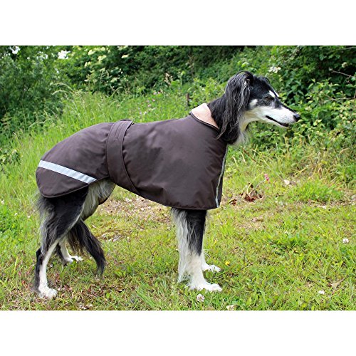Greyhound coat. A coat for all weathers. Tailored for the perfect fit and with chest protection for total cover, while still allowing freedom to run. Teflon treated breathable outer fabric, able to withstand extreme temperatures, with warm, soft fleece lining. Reflective strips for high visibility and added safety. Strap fastenings ensure a secure and flexible fit. Features fold back collar and lead hole. Easily cleaned and machine washable. Made in the UK. Coat size is determined by measuring nape of the neck to base of tail.