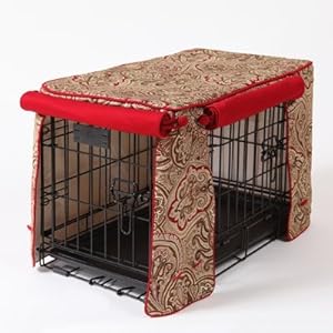 Crimson Espresso with Simply Red Cording in Double Door Stagecoach- (U.S. Patent Pending) Rich and regal, our Crimson Espresso cover sets an elegant mood with striking swirls of chocolate, coffee, ecru and cranberry. Accented with fire-engine red twill cording buttons and loops. * Fully lined with no visible seams * Meticulously stitched and detailed like fine upholstery * Finished with contrasting fabric on cording, buttons and loops * Covered buttons are sewn by hand * Crate Covers & More products are proudly made in U.S.A. * Coordinate beautifully with Crate Covers & More?s dog beds * 100% Satisfaction Guarantee Made to fit MidWest Lifestages Double Door Series and select iCrates Double Doors LS-1648DD 48 Depth 30 Width 33 Height