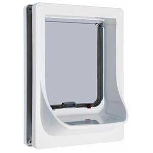 White electromagnetic dog door up to 14 shoulder height self lining to 2? thick 4 way locking. Suitable for large cats and dogs to 14? (360mm) shoulder height Dog Door is supplied with 2 x dog magnets Cat magnets available separately Easy to use 4-Way locking system Self lining to 23/8 (60mm) thick – ideal for all doors Overall Size: 9 1/4 x 11 3/4 (235mm x 300mm) Cut out Size: 8 x 10 1/2 (203mm x 266mm)