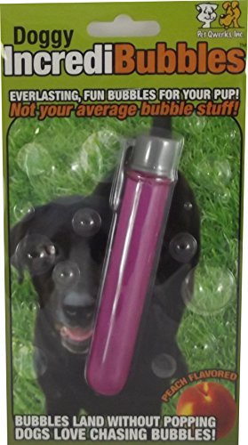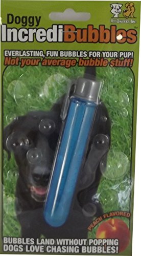 Pet Qwerks Doggy IncrediBubbles Everlasting Fun Exercise Bubbles For Dogs. Blow long-lasting bubbles for pets to chase and pop. Great fun for dogs, cats, kids and adults. Bubbles dry in the air, and land on the ground un-popped, waiting to be attacked by cats and dogs alike. Pets really love chasing and bursting these bubbles. Economical and fantastic fun. Comes in peach flavour (non-toxic). Supplied in a plastic tube complete with wand. Tube approx 12cm long x 2cm diameter (4.75″ x 0.75″). Available in three colours, blue, green or purple, all Peach flavoured. One colour will be selected at random