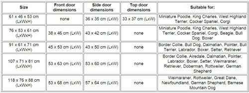 In the wild dogs prefer to rest in caves or sheltered places. The Dog Residence cage is somewhere your dog can settle down and feel safe and comfortable. The zinc-coated bars on the cage allow a good view so that your pet does not feel isolated from the family, but it is also the perfect place for your dog to take time out or where it can rest if it is not well or recovering from an operation. The cage can also be used for training purposes, for example if your puppy is not fully house-trained. And it is ideal when travelling, providing your dog with somewhere safe in the car. The cage must be fixed in the car and your dog should also be harnessed in. The Dog Residence is quick and easy to assemble. There are two removable handles for easy transport. And there is a large door at the front and also one on the side so that your pet can get in and out easily. (Caution: In Size 61 x 46 x 53 cm (LxWxH) the doors are on the sides and the top!) The robust plastic base can be removed for easy cleaning. All different sizes have the bar spacing, 3.8cm. There is also a comfortable cushion which can be washed up to 30°C in the washing machine. Your dog should be allowed to get used to the Dog Cage slowly so that it is a positive experience. Never use the cage to punish your pet. Your dog should feel that it is in a safe and protected environment. The Dog Cage should only be used on a temporary basis. It is not suitable as a long-term home or as a means of training for dogs with behavioural problems!