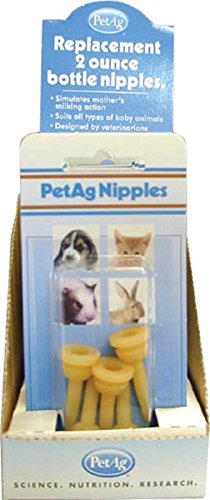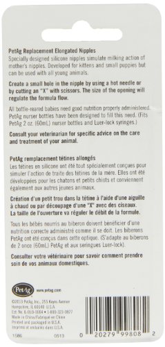 Elongated nipples are long, latex nipples designed for marsupials, various wildlife species and kittens. They may be used with the petag 2 oz nurser or any volume luer-lock syringe. Replacement elongated nipples are available on a card containing 5.