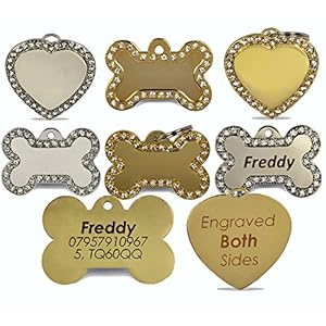 Top of the range Bling Diamante Pet Tags, shaped as a heart Or a Bone in either Gold Or Silver