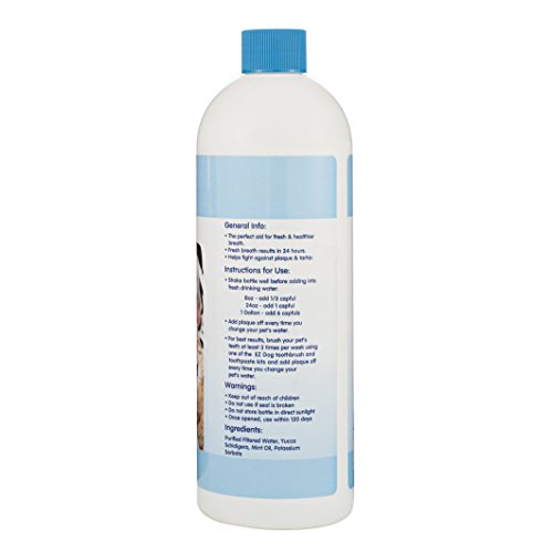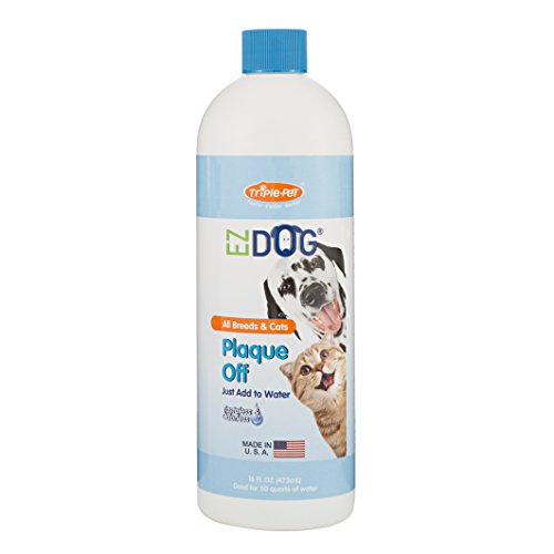 Triple Pet-EZ Dog Pet Plaque Off. The perfect aid for fresh and healthier breath! Get fresh breath results within twenty-four hours. Helps fight against plaque and tartar. Tasteless and odorless. Contains 16oz of plaque off. Good for fifty quarts of water. Made in USA.