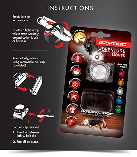 When Only The Best Dog Light Will Do The EzyDog Adventure lights are high visibility, waterproof pet beacons built for outdoor use. With a long battery life and fully tested to military standards, it will never let you down. High Visibility These Dog safety lights are visible up to a distance of 5km. However far away your dog is, they are still safe at night. Strong and Durable for your Dog’s Safety These high quality dog lights can withstand loads of 100 kilograms. They are completely waterproof and have over 100 hours of battery time. We are so confident of thieir strength and quality that they come with a 3 year extended warranty Easy to Use The lights come with a velcro strap to attach to any existing dog lead, harness or collar. Turning the light on and off is easy – simply rotate the top to turn on and off Features: Waterproof to 100m Super Strong – Can withstand a load of 100kg Visible up to 5km 100hrs battery life when steady on, 250 hours when flashing Available in red, orange, green, blue and white THE LONG LASTING, QUALITY DOG SAFETY LIGHT