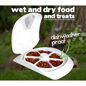 Feed and Go has 6 x 8oz cup size feeding slots within the tray, which is dishwasher proof so you can easily keep it clean and fresh. The tray in a Feed and Go is made from polypropylene, a pet and food friendly plastic. Unlike other feeders, your pet will NOT be able to move their Feed and Go manually, as there is a locking mechanism between the feed slots