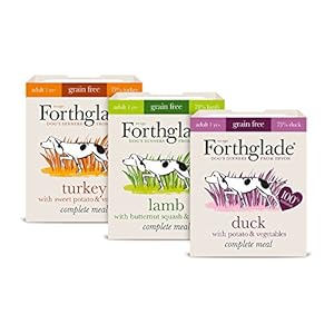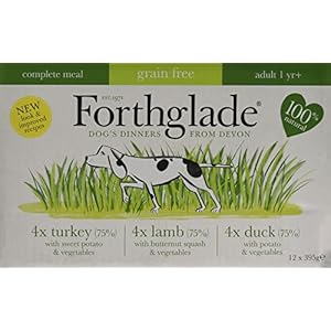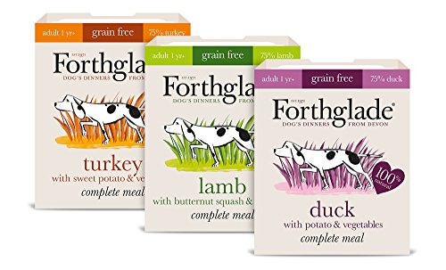 Forthglade Grain Free Adult Dog Variety features all three delicious flavours all of which are free from artificial nasties & use only the best cuts of meat to provide the dogs with the best meal possible. All three of the formulas utilise salmon oil & seaweed which do a great job of improving overall condition as well as skin & coat health. Glucosamine & chondroitin have also been included as they provide the building blocks for solid joint structures. 3 delicious flavours No unnecessary bulking agents No dairy products or eggs Each pack contains 4 x Duck 4 x Lamb 4 x Turkey Composition (Duck): Duck (50%), Turkey (22%), Potato (4%), Peas (2%), Carrots (2%), Fructooligosaccharides (FOS), Salmon Oil, Seaweed, Minerals, Vitamins, Yucca Extract, Glucosamine, Chondroitin, Parsley, Garlic & Rosemary. Analytical Constituents (Duck): Crude Protein 12%, Crude Fibres 0.5%, Crude Oils & Fats 8%, Crude Ash 4% & Moisture 70% Composition (Lamb): Lamb (50%), Turkey (22%), Butternut Squash (4%), Peas (2%), Carrots (2%), Fructooligosaccharides (FOS), Salmon Oil, Seaweed, Minerals, Vitamins, Yucca Extract, Glucosamine, Chondroitin, Parsley, Garlic & Rosemary. Analytical Constituents (Lamb): Crude Protein 11.5%, Crude Fibres 0.7%, Crude Oils & Fats 9%, Crude Ash 2.5% & Moisture 70% Composition (Turkey with Sweet Potato): Turkey (72%), Sweet Potato (4%), Peas (2%), Carrots (2%), Fructooligosaccharides (FOS), Salmon Oil, Seaweed, Minerals, Vitamins, Yucca Extract, Glucosamine, Chondroitin, Parsley, Garlic & Rosemary. Analytical Constituents (Turkey with Sweet Potato): Crude Protein 11%, Crude Fibres 0.6%, Crude Oils & Fats 7%, Crude Ash 2.3% & Moisture 70%