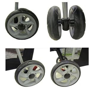 * Wheels: large 7″, 2 x swivel front wheels, 2 rear wheels;