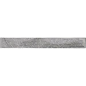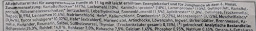 Potato flakes (47%), salmon meals (10%), rabbit protein (10%), lamb protein (10%), poultry fat, potato protein, sliced beet molasses (sugar-free), hydrolysed liver, sunflower oil (1.5%), apple pomace (1.0%), cellulose, dried whole egg, rapeseed oil (0.5%), flax seed (0.4%), sodium chloride, yeast, potassium chloride, cranberries (0.22%), marine algae (0.15%), mussel meat (0.04%), yucca shidigera (0.02%), milk thistle, artichoke, dandelion, ginger, birch leaves, nettle, chamomile, coriander, rosemary, sage, liquorice root, thyme, yeast (extract), (dried herbs, in total: 0.15%) ).