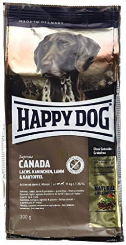 Happy Dog Canada has been specially developed and composed for active, fully grown dogs with lightly increased energy requirements. The food contains no grains and has a high proportion of meat. This also makes the food suitable for sensitive dogs from the age of 6 months. The tasty complete diet Canada is produced with fine salmon, tasty rabbit, lamb and gluten-free potatoes.