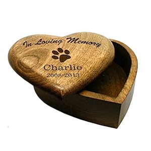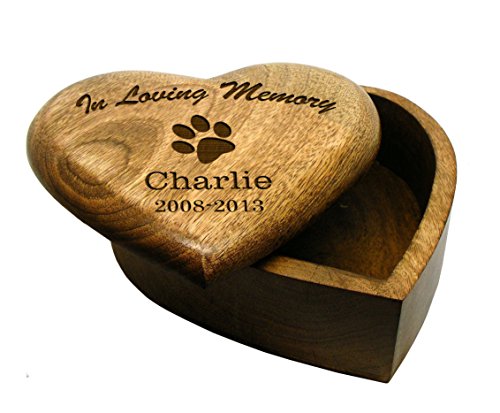 A lovely genuine Mango wooden heart shaped box to store your beloved pets ashes in. This box is engraved with the words In Loving Memory, along with a silhouette of a paw.. We can add the name of your pet and one or two dates as per the example image.