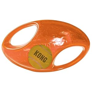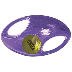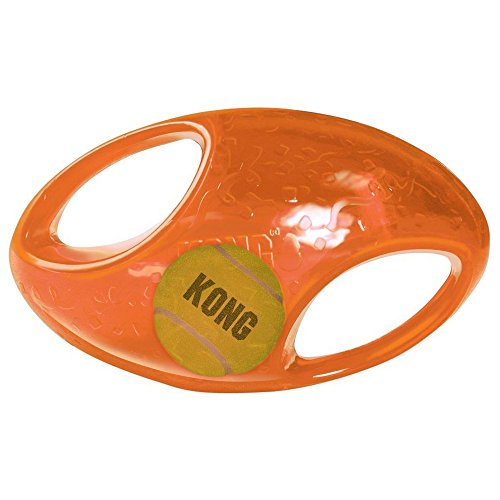 A two-in-one ball toy for twice the interactive fun. The interior tennis ball and loud squeak entice play, while the handles make pick-up and shaking easy. Ideal for games of fetch. Available in two shapes: Ball and Football. Available in two sizes: Medium/Large (Ball is Blue and Football is Orange) and Large/X Large (Ball is Red and Football is Purple).