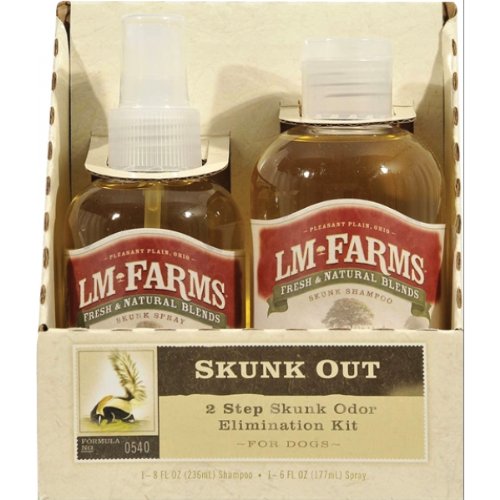 LM-Farms 2-step dog skunk odor elimination kit has shampoo and spray that work together to get rid of skunk odor completely. Features fresh and natural blends. Ingredients used in shampoo are water, plant base surfactant blend, glycerin and plant cellulose thickener. Also used malodor counteracting, preservative, fragrance and colors. Spray include ingredients that are water, glycerin, plant based surfactant, pro-vitamin B5 and guar gum conditioner etc. Does not bleach coat.