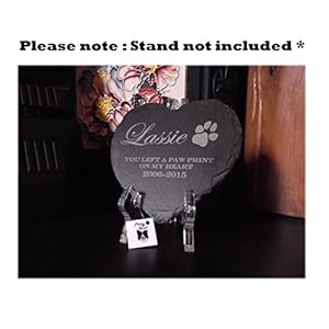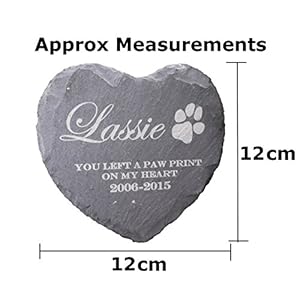 PawGear only source the best quality materials These lovely Heart shaped natural slates are ideal as a small memorial plaque to remember your loved one The natural imperfections form an integral part of the design Because this is a natural product they may differ slightly from piece to piece.The plaque comes complete with padded feet on the back to widen its variety of uses. Please read the following information very carefully: Please send us a message via Amazon when you make a purchase explaining the details you would like us to Engrave onto the plaque This will save any unnecessarily delays shipping out your parcel Please use / to indicate the end of the line Example : Your Pets Name/ Your Message/ Date/ Please take extra care when Writing/Typing your message as we cannot be held responsible for any errors or spelling mistakes Font used for your Pets name will be : Edwardian Script ITC Fonts used for your message and date will be : Engravers MT Other fonts maybe available upon request The Paw Print will be engraved unless its removel is requested Pets Name: Max of 15 characters/text And upto an additional 3 lines of text to include your message and the date if required : Message: Max of 30 characters/text Date: Max of 20 characters/text The more characters/text you request the smaller the text will be Approx Size of the heart : 12cm x 12cm All sizes are Approximate The plaque comes complete with padded feet on the back to widen its variety of uses The item is designed to be used either indoors or out and the padded feet will protect any polished surface It can also be mounted within a boxed photo frame and the padded feet help it to sit slightly proud For added protection from the elements when used outdoors we advise that the plaque is sealed with a stone sealer, we can do this for you on request- please note: this slightly darkens the finish The stone and letting can vary in colour slightly as it a natural product
