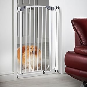 Extra tall self-extending white pet gate for dogs and cats – ideal for use on doors, corridors and stairs