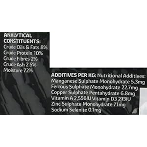 Typical AnalysisProtein 10%, Oil 8%, Fibre 2.5%, Ash 2%, Moisture 72%, Vitamin A 2,556IU, Vitamin D3 213IU