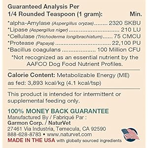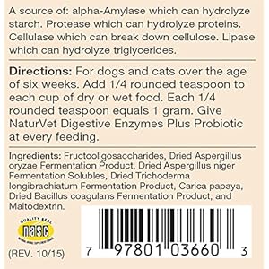 NaturVet Enzymes is a concentrated enzyme blend derived from vegetable sources and not from animal sources. NaturVet Enzymes contains sources of live/viable naturally-occurring microorganisms recommended to help support a healthy digestive tract. Ideal for use when changing diet, after deworming, or after illness.