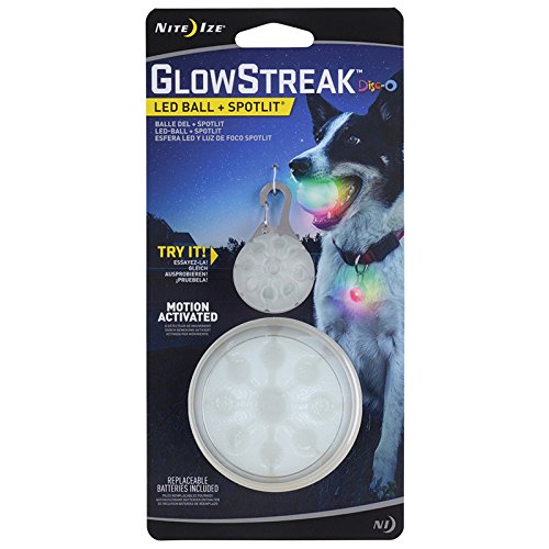The GlowStreak LED Ball is the most technologically advanced nighttime fetch ball ever made and holds up to the best arm or ball launchers around. This robust rubber ball has a protected inner core that contains an advanced motion-activated LED module with bright colour-changing Disc-O LEDs and it turns on with a simple bounce. The Nite Ize GlowStreak is also available in a combo pack with a one-of-a-kind GlowStreak-matching SpotLit LED Collar light so you can keep track of your dog day and night. GlowStreak LED Ball Features: Disc-O LEDs Durable LED Ball for nighttime play Motion activated Auto shut-off after 10 minutes of inactivity Durable rubber construction Waterproof – it floats! Run time: 35 hours 2 replaceable CR2032 batteries included SpotLit LED Collar Light Features: Push on/off Glows and flashes Water resistant Run time: Glow: 20 hours | Flash: 25 hours Easily replaceable 2x 2016 batteries included GlowStreak LED Ball Measurements: Diameter: 2.5″ (6.3cm) Weight: 3.9oz (112g) SpotLit LED Collar Light Measurements: Dimensions: 2.12″ x 1.28″ x 0.85″ (5.39cm x 3.27cm x 2.18cm) Weight: 0.56oz (16g)