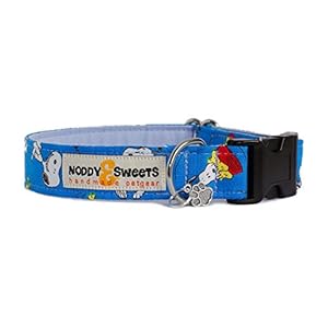 “Noddy & Sweets” Handmade Dog Collar. Cotton backing plus reinforced webbing with Charm. Adjustable size. Slight variations of the pattern can occur due to the way fabric is cut & used.