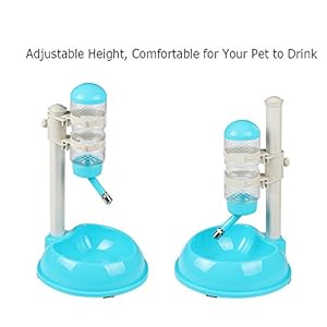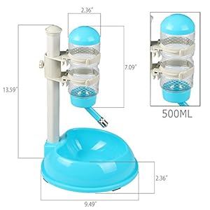 Features– Worked as food bowl and water bottle that ensures your pet will not thirsty and hungry when you are go out. The bowl and bottle can be used separately– Water bottle featured a roller ball nozzle that dispenses water as pet licks; There are 3 roller balls in nozzle, you can take off 1-2 roller balls if water flows little– Height Adjustable Design: you can adjust a suitable height for your pets– Non-toxic plastic material, safe for your pet to use– Suitable for small dogs, cats, rabbits, hamsters, squirrels, etcSpecificationsCapacity: 500MLMaterial: Plastic + Stainless steelWeight: 499.8gPackage Includes1 x Water Feeder