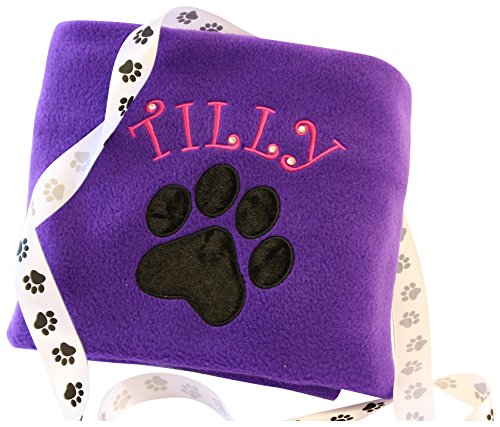 Personalised Embroidered Pet Dog Blanket With Diamanté Rhinestones Gorgeous personalised dog blanket embroidered with a cute velvet paw print appliqué design and curly font embellished with crystals and your choice of name embroidered. You can choose the colour thread you require for the lettering. Perfect warm snugly fleece for covering furniture or your dogs bed This makes the perfect gift for any spoilt dog!