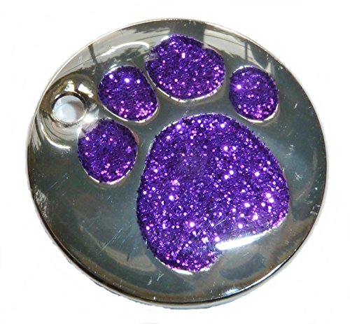 This is a medium sized pet tag with coloured glitter paw print design on the front. The design is protected by an exceptionally hard wearing clear epoxy coating. This tag feature a shiny silver (nickel) finish to the front and sides and are engravable on the highly polished nickel back, the tag is 25mm in diameter and is supplied with a split ring for attaching to pets collar.
