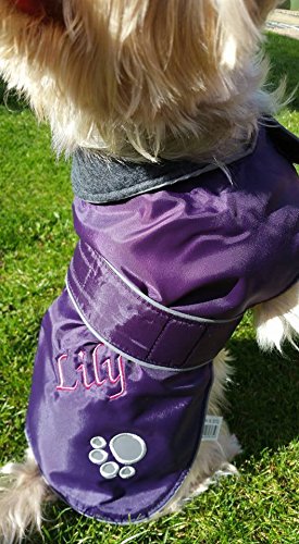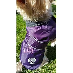 This listing is for 1 x Personalised “Orleans” Dog Rain Coat. Product Details: with soft fleece lining. with reflecting piping and paw motif. loops for hind legs. with velcro fastening. made of hard-wearing nylon. colour of coat is Purple. Name embroidered in Hot Pink. The name is shown in the Large Font – the more characters – the smaller the text may have to be. Please note that personalised goods can not be returned for a refund – so please make sure to measure your pet before purchase. Please message us directly to tell us your pets name ~ Please also include a contact phone number. Choice of sizes: Extra small 25cm to fit dog 25cm in length and 30-38cm tummy. Extra Small 30cm to fit dog 30cm in length and 35-42cm tummy. Small 35cm to fit dog 35cm in length and 38-50cm tummy. Small 40cm to fit dog 40cm in length and 42-55cm tummy. Small/Medium 45 cm to fit dog 45cm in length and 45-65 tummy. Medium 50cm to fit dog 50cm in length and 50-70 tummy. Length is taken base of neck to base of tail…..tummy is tummy circumference.