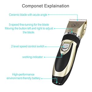Rechargeable and cordless: Pet grooming clippers equipped with a high quality charger and a high capacity detachable li-battery,charging for five hours, it can sustain uses of 70 minutes. Lightweight and cordless design for easy use