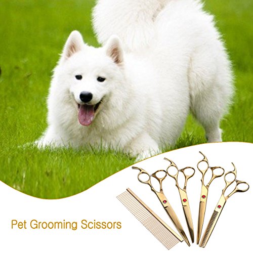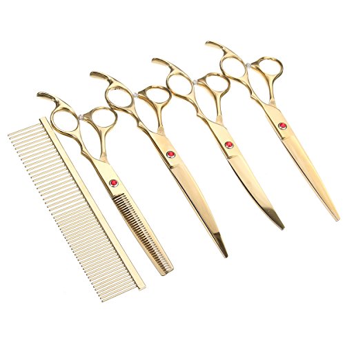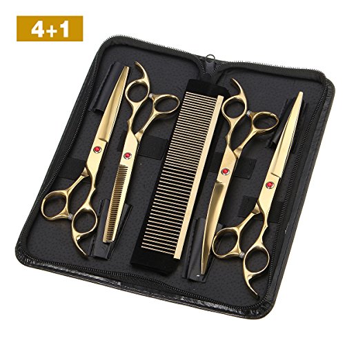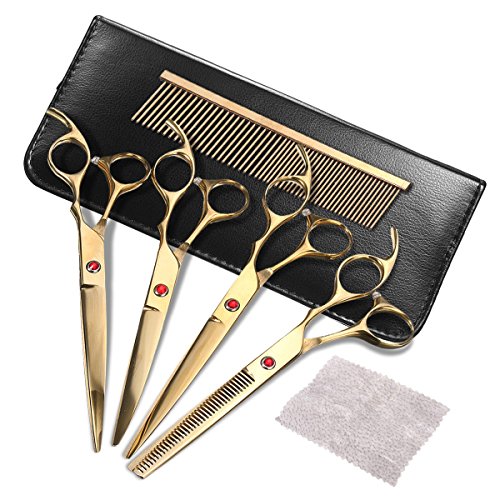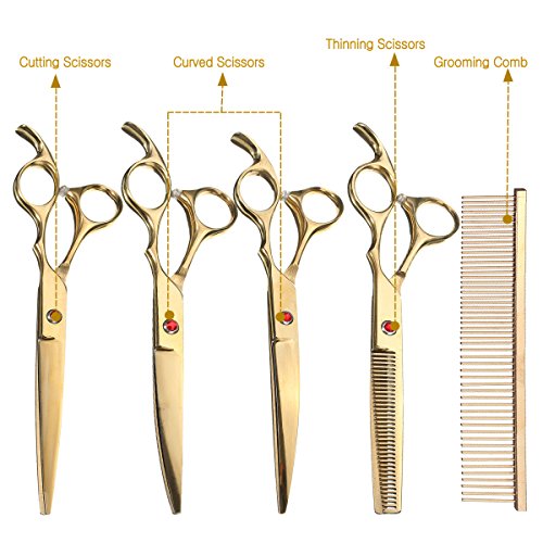 ★Complete Pet Grooming Scissors Kit – 1 Cutting scissors, 1 Curved scissors point up, 1 Curved scissors point down, 1 Thinning scissors, 1 Grooming comb with a clean cloth which to clean the stainless steel scissors and for a better protection. This wonderful pet trimming kit suits all your pets’ grooming needs and requirements.