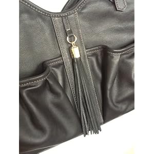 All leather construction, Tassel fringe detail, Adjustable straps, 2 open exterior pockets on front and 1 secure side zipper pocket on back