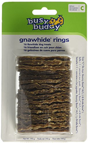 The Busy Buddy Gnawhide Rings are delicious chew treats that are designed to fit select Busy Buddy Bouncy Bone and Bristle Bone toys. These irresistible treats also make great treats for everyday rewards. Pack of 16 for all sizes. Size A: designed to fit the Small Bouncy Bone and X-Small Bristle Bone, Size B: designed to fit the Medium Bouncy Bone and the Small and Medium Bristle Bone, Size C: designed to fit the Medium/Large and Large Bouncy Bone and the Large Bristle Bone.