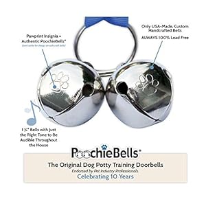 PoochieBells the Original & Trusted Housetraining & Potty Time Dog Doorbell for Loving Dog Families Since 2005. A clear, pleasant and easy way for your family to know when its potty time for your furry best friend. All PoochieBells are individually handcrafted in the USA. Step by step guide included with link to free interchangeable PoochieBells ribbon for your home. Fun & Whimsy Doggy Dialogue Collection