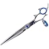 This is the straight blade swivel-thumb model from the Double Medalist Competition Line. These shears are EXTREMELY smooth and comfortable. They have blades that are enhanced with added cobalt as well as nylon glide strips at the back of the blade. The steel is VG-10, known all over the world as the finest Japanese steel available, meaning your edge will be scary and it will last a really long time. Where normally there is a simple tension assembly with a screw, a bolt, and a washer, the Medalist line has a ball bearing system which adds to the smooth “gliding” feeling when cutting. These are high end, top of the line shears for serious pet groomers only!! All Shark Fin grooming shears come with a free shark fin case, the patented finger fitting system, polishing cloth, and lubricating oil pen.