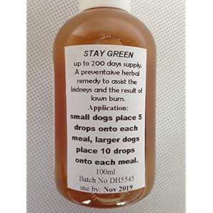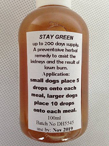 STAY GREEN Lawn Burns are caused by Dog’s urine which contains ammonia which can burn the grass and causes it to discolour. Urination causes ammonia to be concentrated in a small area which can cause quite a discolouration, Using only natural human food grade herbal ingredients STAY GREEN reduces urine ammonia and PH levels by binding the ammonia and naturally reducing the PH level. STAY GREEN contains: Aqueous extracts of Apium seed {wild celery seed} Petroselenium herb {from the parsley family} Wild Sage Quassia bark extract Fennel seed and Hibiscus flowers. STAY GREEN Added daily to your dogs normal food {Small dogs five drops, Large dogs ten drops} Supplied in a 100ml bottle lasting between three to six months supply.